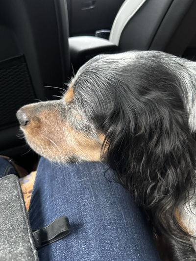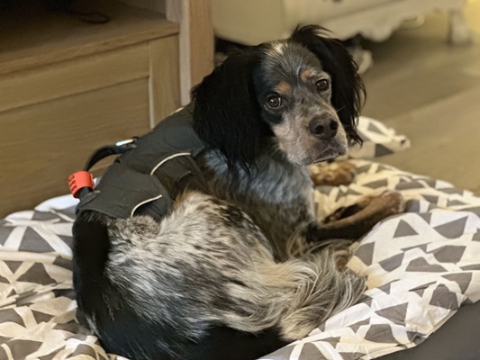 After the vet, he came with us to our store. I feel like as long as we're with him, we can take him everywhere with us, he's happy. As long as I'm in his field of vision, he's happy.