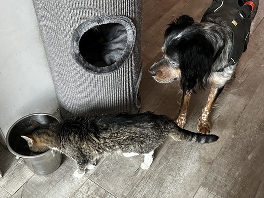 I'm already starting to play with him with treats to teach him to listen. So far he sits well when I have to put his leash on him and he waits (he probably already did this in his foster family). He's waiting for his bowl too. He passes by the cat's bowl without going to eat his kibble.